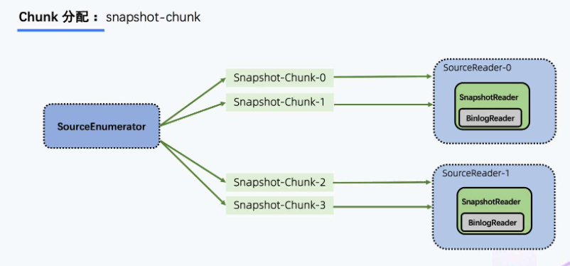 基于 FLIP-27 实现,通过下图可以看到有 SourceEnumerator 的组件,这个组件主要用来划分 chunk,将划分好的 Chunk 提供给下游的快照读取器(SourceReader)去读取,通过把 chunk 分发给不同的 SourceReader 便实现了并发读取 Snapshot Chunk 的过程, 同时基于 FLIP-27 方便地做到 chunk 粒度的 checkpoint。