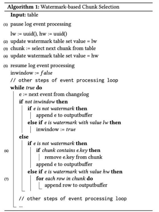 Chunk 读取算法是通过在 DB 维护一张信号表,再通过信号表在 binlog 文件中打点,记录每个 chunk 读取前的 Low Position (低位点) 和读取结束之后 High Position (高位点) ,在低位点和高位点之间去查询该 Chunk 的全量数据。在读取出这一部分 Chunk 的数据之后,再将这 2 个位点之间的 binlog 增量数据合并到 chunk 所属的全量数据,从而得到高位点时刻,该 chunk 对应的全量数据。