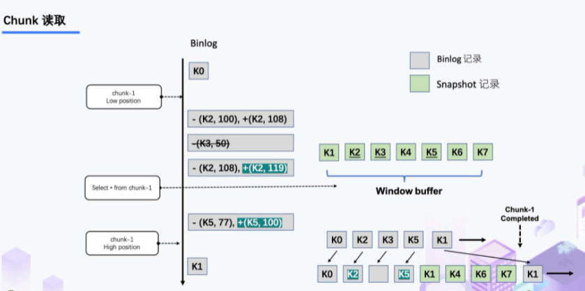 观察图片中右下角最终的输出,会发现在消费该 chunk 的 binlog 时,出现的 key 是 k2、k3、k5,我们前往 buffer 将这些 key 做标记。