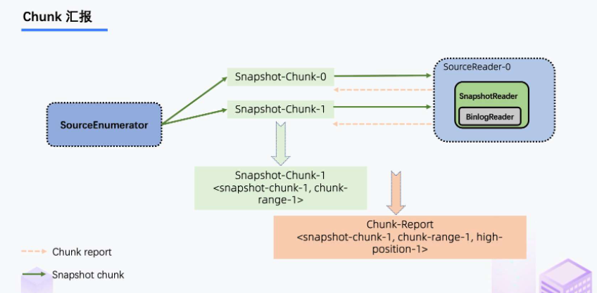当 Snapshot Chunk 读取完成之后,需要有一个汇报的流程,如下图中橘色的汇报信息,将 Snapshot Chunk 完成信息汇报给 SourceEnumerator。