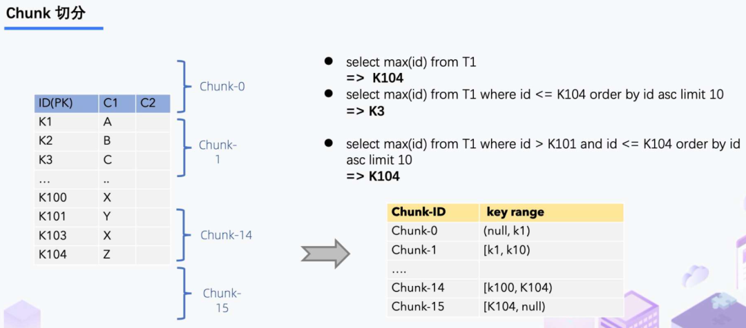 假设每个 Chunk 的步长为 10,按照这个规则进行切分,只需要把这些 Chunk 的区间做成左开右闭或者左闭右开的区间,保证衔接后的区间能够等于表的主键区间即可。