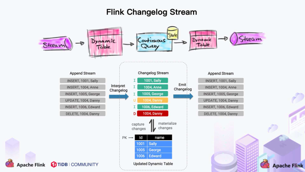 在 Flink SQL 中,数据从一个算子以 Changelog Stream 的形式流向另外一个算子时,任意时刻的 Changelog Stream 可以翻译为一个表,也可以翻译为一个流。