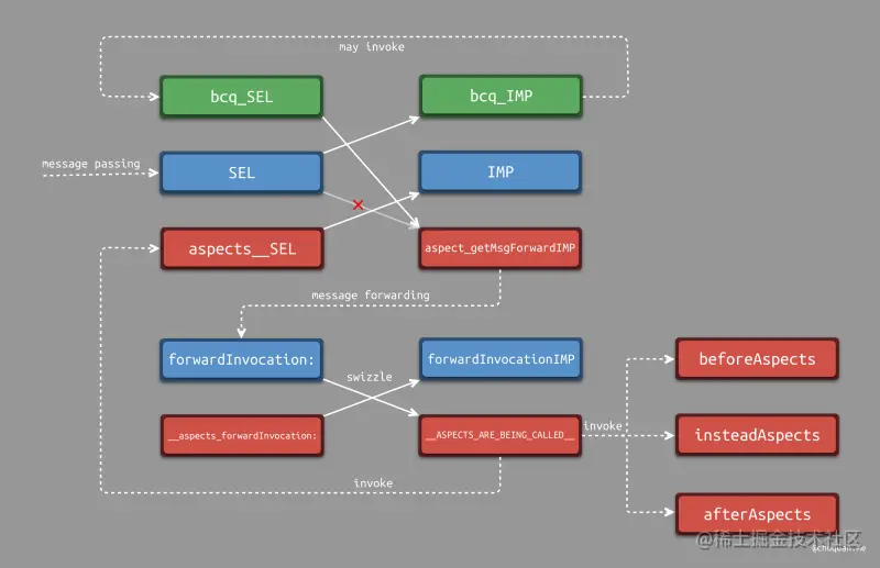 如上图所示,假如我们对 SEL 与 bcq_SEL 进行了 swizzle。那么,bcq_SEL 的实现将指向 SEL 的实现 aspect_getMsgForwardIMP;SEL 的实现将指向 bcq_SEL 的实现 bcq_IMP。