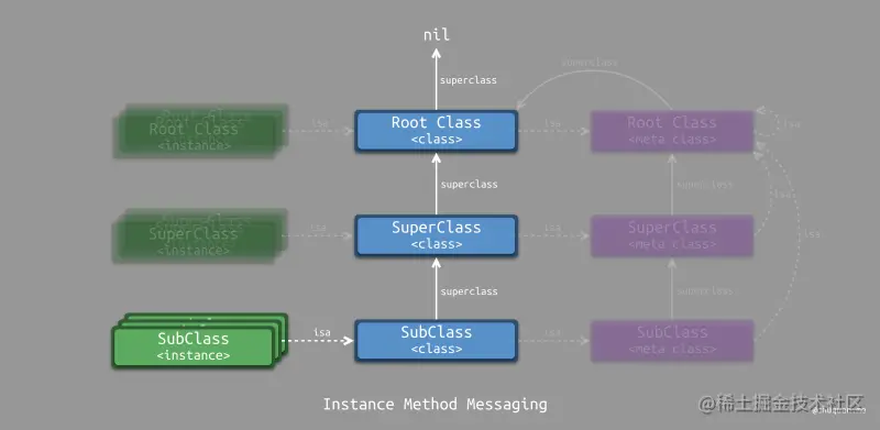 对于实例方法,消息传递时,根据当前实例对象的 isa 指针,找到其所属的类对象,并在类对象的方法列表中查找。如果找到,则执行;否则,根据 superclass 指针,找到类对象的超类对象,并在超类对象的方法列表中查找,以此类推,如下所示。
