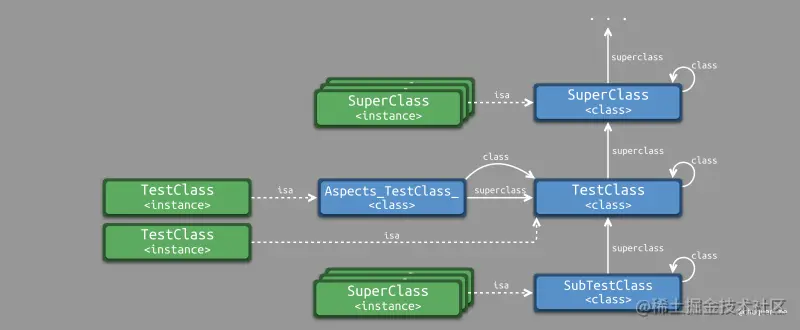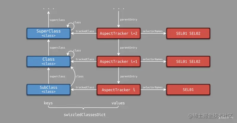 本质上,Aspects 利用了 正向的类对象继承链 和 反向的追踪器链,通过全局字典 swizzledClassDict 进行绑定,形成了一个双向链表,便于判断是否允许对类对象的实例方法进行 hook。