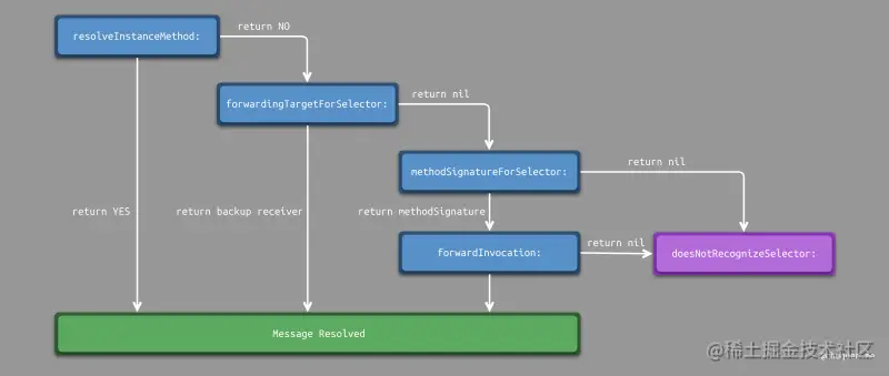 如果返回 methodSignature,则进入 forwardInvocation。对象会创建一个表示消息的 NSInvocation 对象,把与尚未处理的消息有关的全部细节都封装在 anInvocation 中,包括 selector,target,参数。在这个方法中可以修改实现方法,修改响应对象等,如果方法调用成功,则结束。如果依然不能正确响应消息,则报错 unrecognized selector sent to instance。
