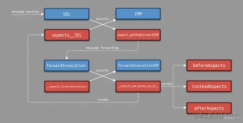 基于 aspect_hookClass 返回的对象,Aspects 将修改该对象的两个方法,使其指向 Aspects 的两个方法实现,即上述我们介绍的 核心方法交换。