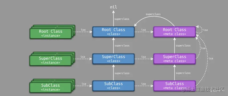 因此,我们需要了解这些对象之间的关系。下图所示,为 Objective-C 对象在内存中的引用关系图。