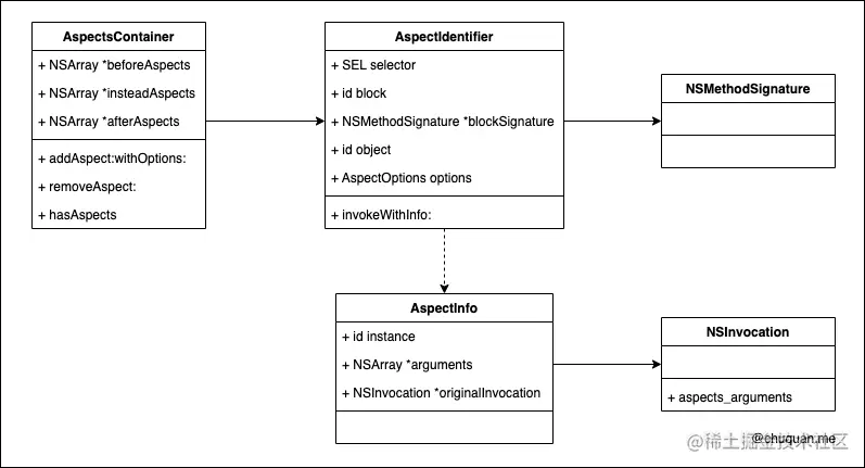 当 hook 实例方法时,Aspects 会为 实例对象 或 类对象 注册关联对象 AspectsContainer。AspectsContainer 保存了用户 hook 的目标方法、执行闭包、闭包参数、执行时机等信息。下图所示,为 AspectsContainer 引用关系图。