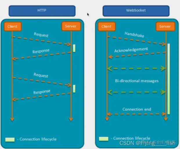 - WebSocket 使得客户端和服务器之间的数据交换变得更加简单,允许服务端主动向客户端推送数据。在 WebSocket API 中,浏览器和服务器只需要完成一次握手,两者之间就直接可以创建持久性的连接,并进行双向数据传输。