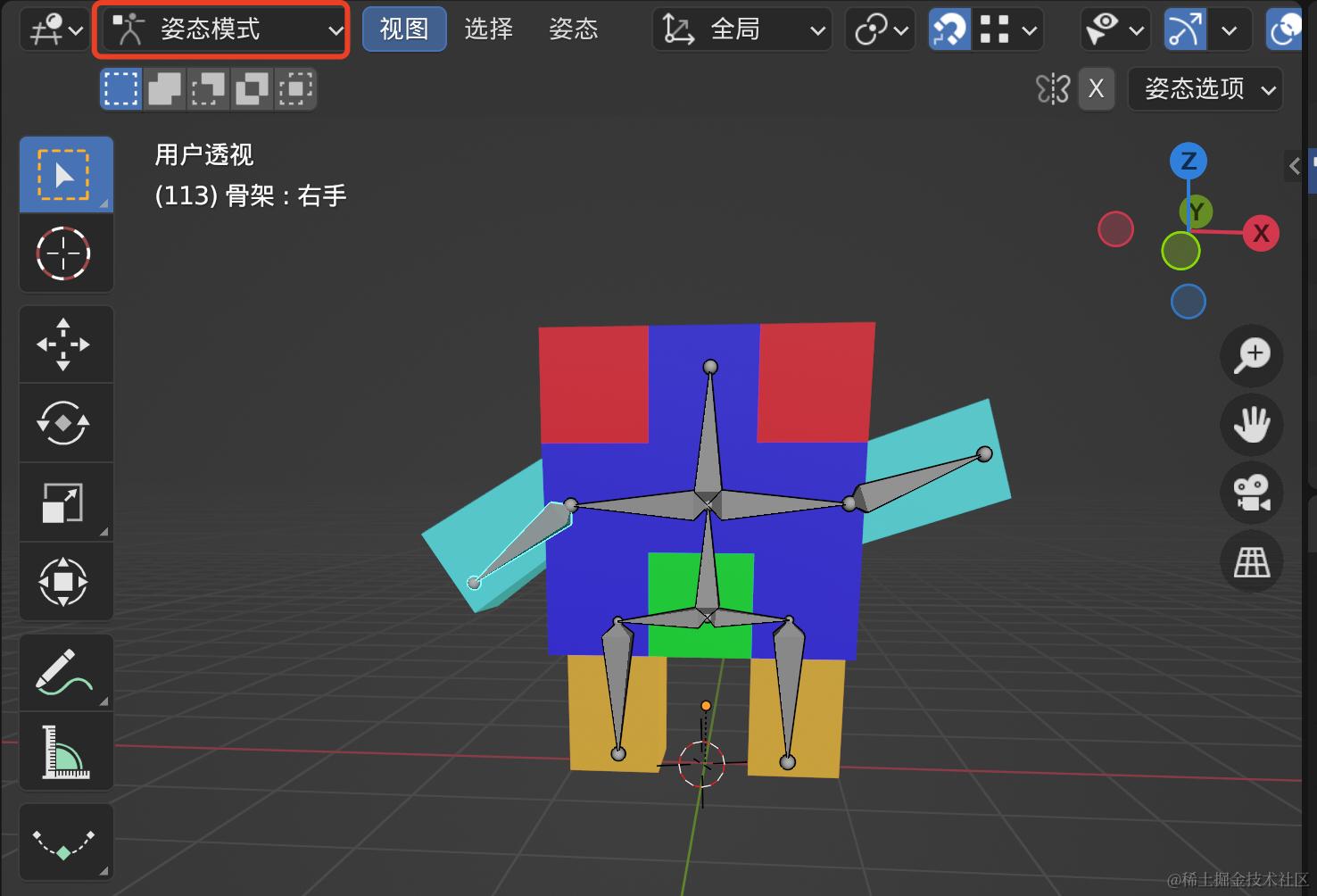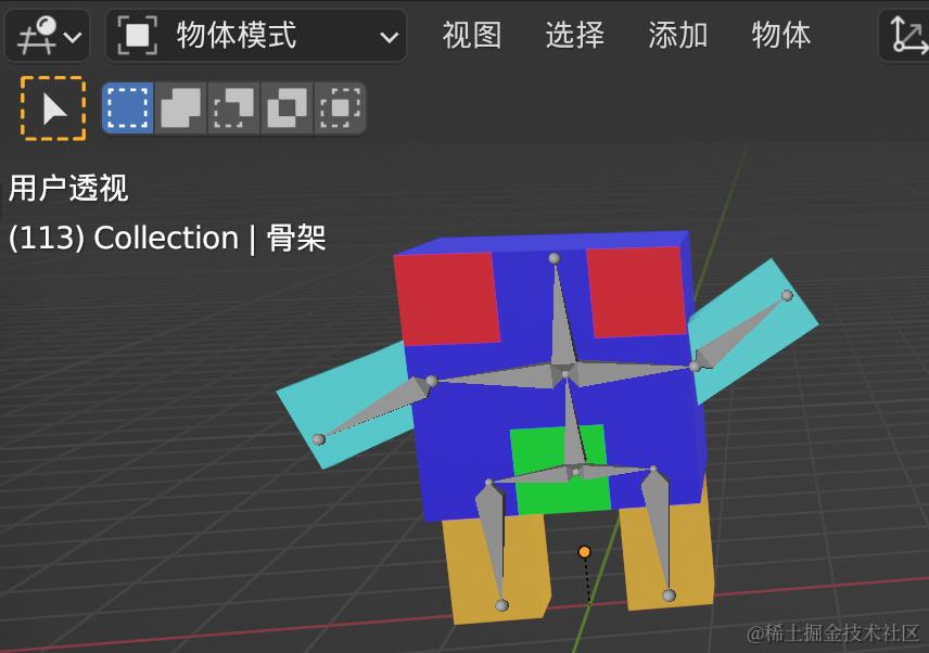回到物体模式,我们选择骨架,然后切换到姿态模式