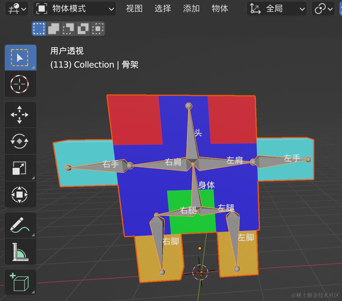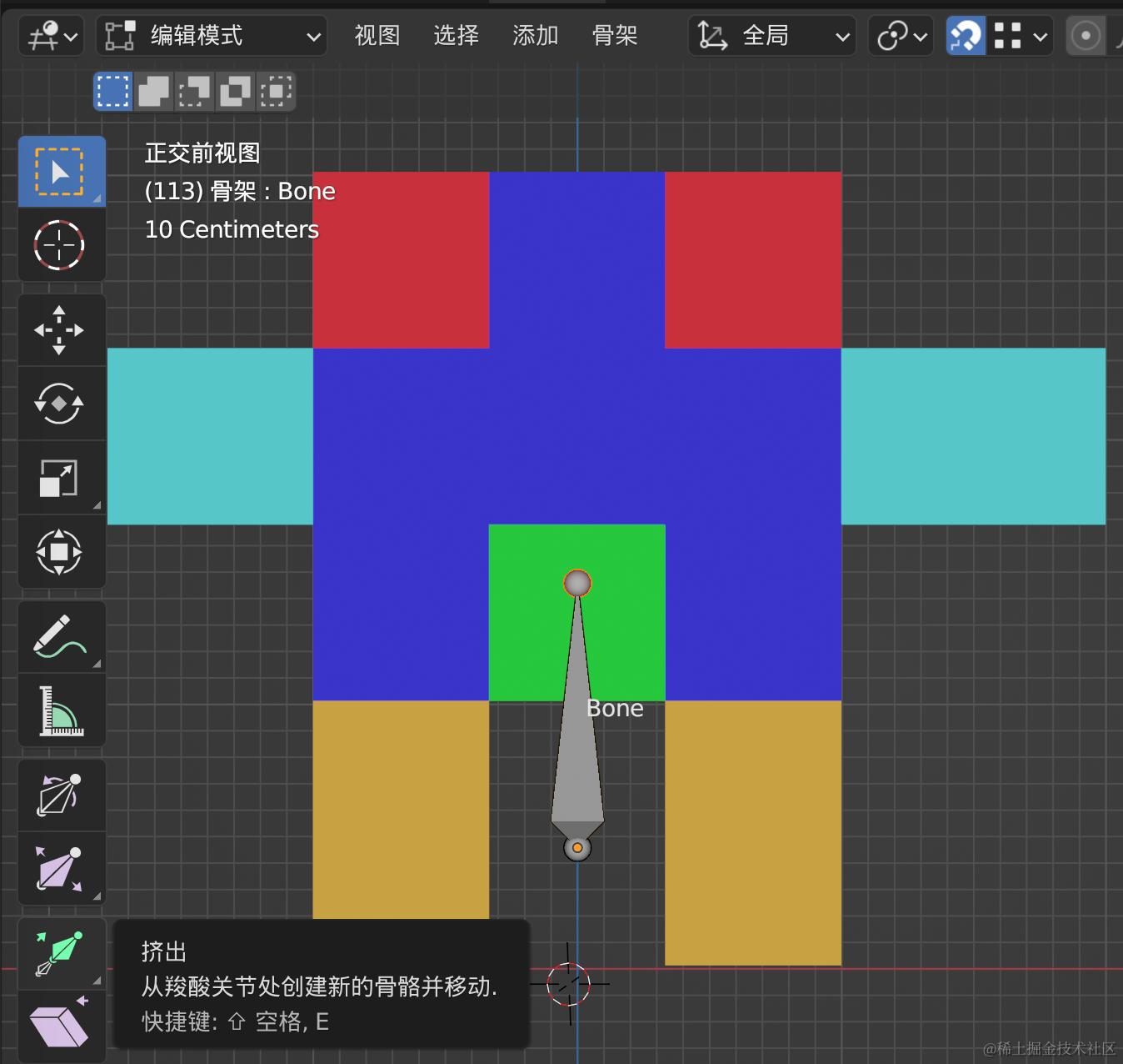 使用挤出我们就能搭建一个简单的骨骼结构,最终的效果如下: