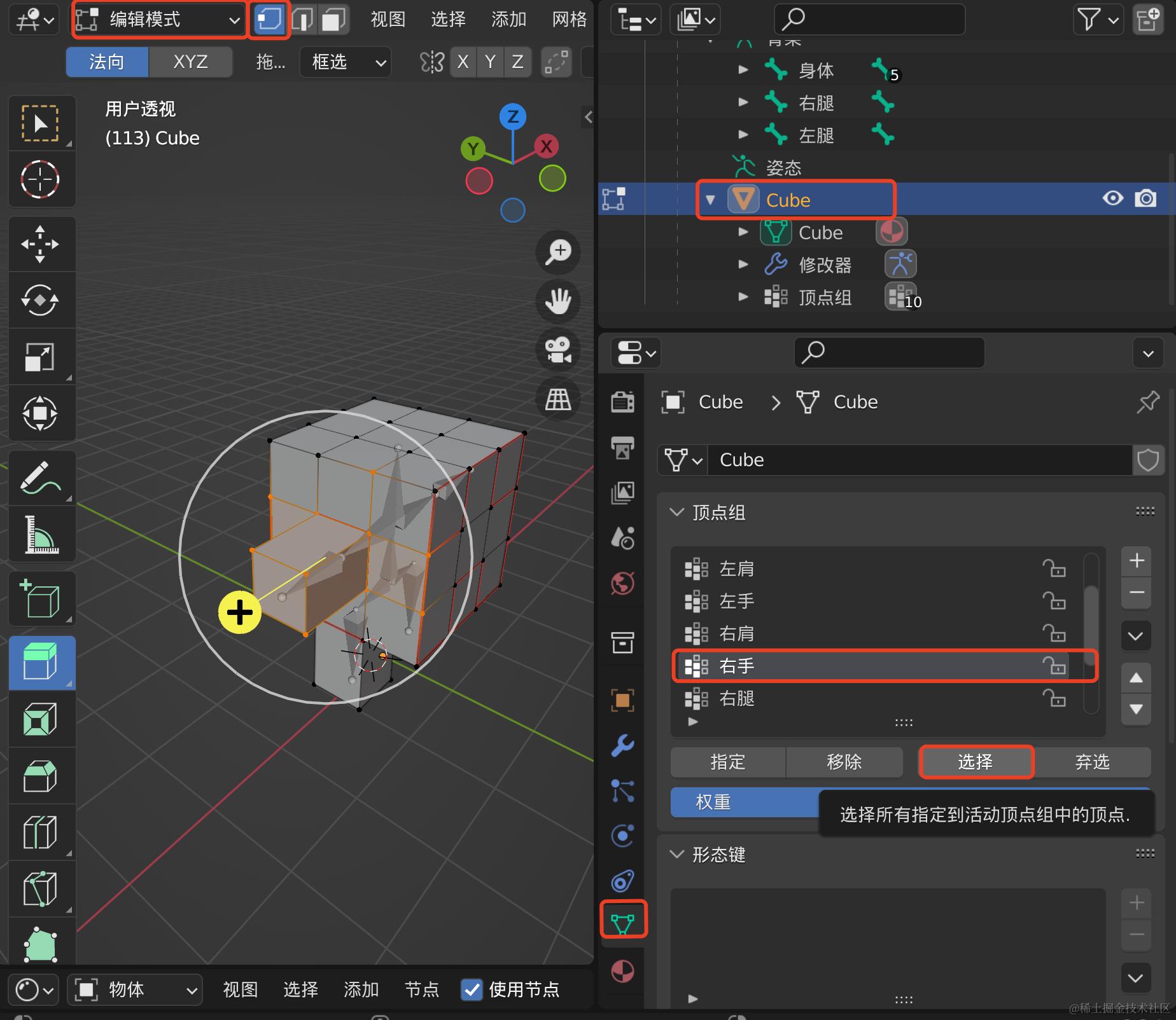 - 选择: 将选中顶点组的顶点在视图中追加选中,相当于选中的加法