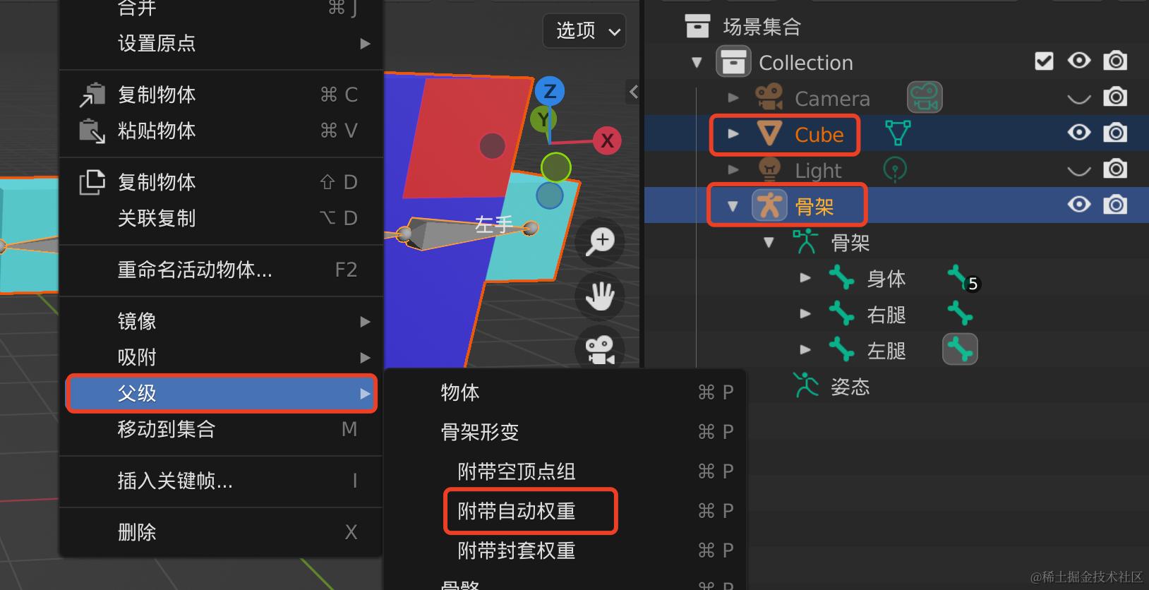 注意此时大纲视图中的选中状态,右键选择父级/附带自动权重