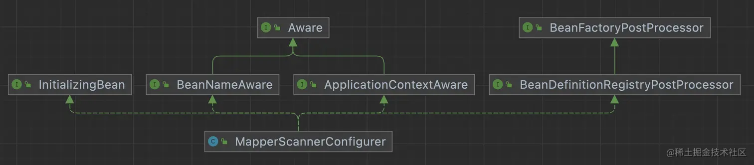 - annotationClass则是指定了增加了这种注解类的类需要被Spring进行管理,比如增加了Mapper注解的类需要被Spring管理。生成MapperScannerConfigurer这个类型的beanDefinition,并且把MapperScan注解的配置信息添加到该beanDefinition的属性集合中。