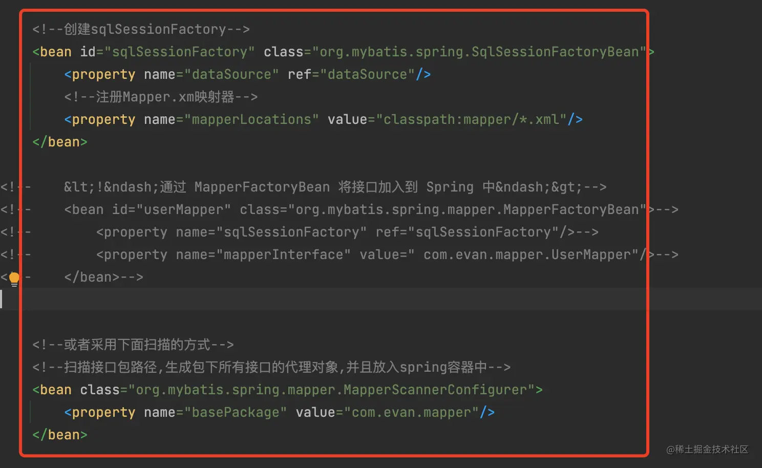- 配置SqlSessionFactoryBean的 Spring Bean,设置数据源属性dataSource,还可以配置configLocation(mybatis-config.xml配置文件的路径)、mapperLocations(XML映射文件的路径)等属性,这样让 Spring 和 MyBatis 完美的整合到一起了