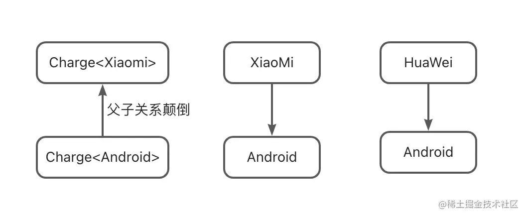以手机为例,Android是手机类,还有XioMi和HuaWei两个子类,它俩和Android是继承关系,那么Charger<XiaoMi>、Charger<HuaWei>和Charger<Android>之间有什么关系?