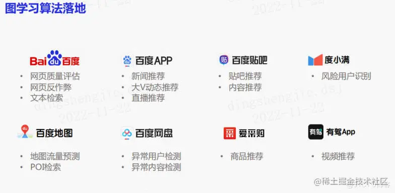 PGL在百度内部已经进行了广泛应用。包括百度搜索中的网页质量评估,会把网页构成一个动态图,并在图上进行图分类的任务。百度搜索还使用PGL进行网页反作弊,即对大规模节点进行检测。在文本检索应用中,尝试使用图神经网络与自然语言处理中的语言模型相结合。在其他情况下,的落地场景有推荐系统、风控、百度地图中的流量预测、POI检索等。