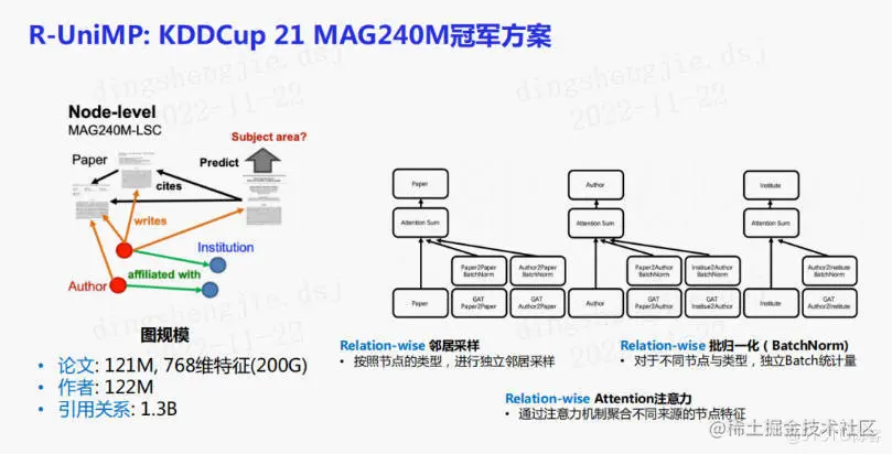 后续还把UniMP应用到更大规模的KDDCup 21的比赛中,将UniMP同构算法做了异构图的拓展,使其在异构图场景下进行分类任务。具体地,在节点邻居采样、批归一化和注意力机制中考虑节点之间的关系类型。