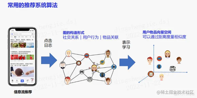 可以将其与图学习结合,使用点击日志来构造图关系(包括社交关系、用户行为、物品关联),然后通过表示学习构造用户物品的向量空间。在这个空间上就可以度量物品之间的相似性,以及用户之间的相似性,进而使用其进行推荐。