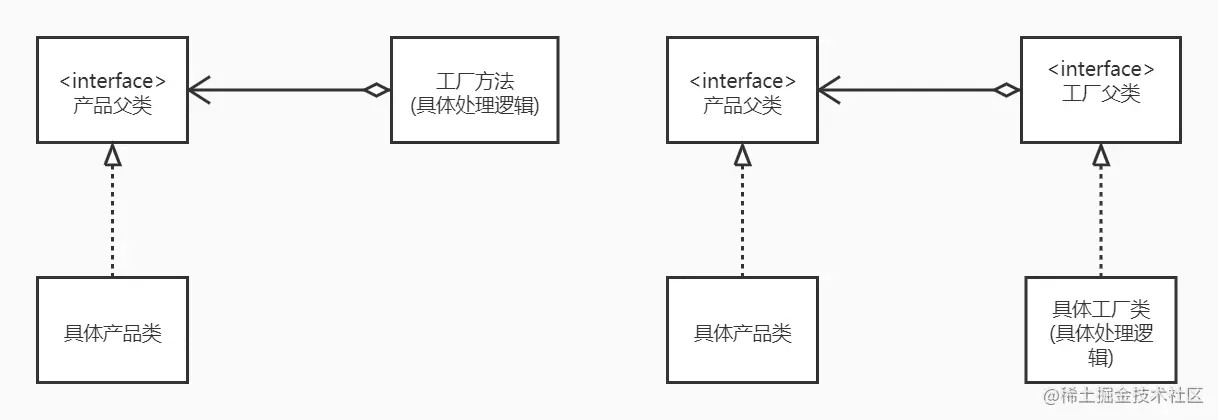 如上图的右边部分,更加符合开闭原则,新增一个产品类,只需要新增一个工厂实现类和具体产品实现类即可。再也没有多个 if-else 嵌套的情况了。