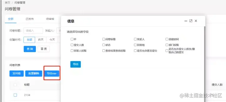 问卷列表增加用户数据导出功能,导出数据支持自定义勾选字段