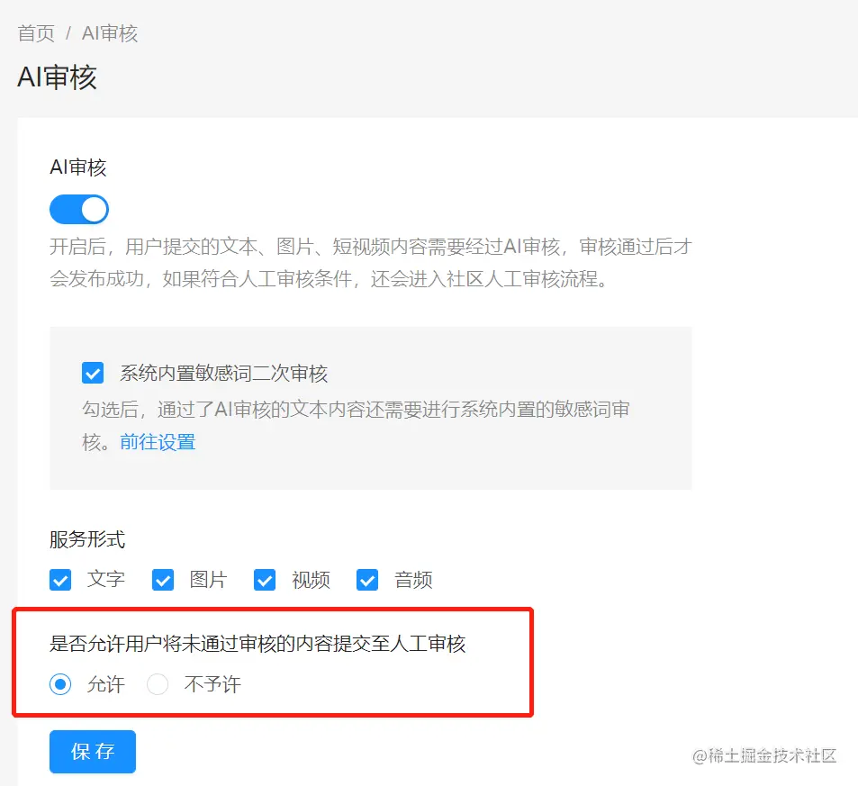 AI审核较为严格,容易被误审核,因此推出可提交给人工审核的功能,此功能是否开启可在后台配置。