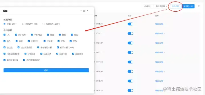 用户列表增加用户数据“导出数据”按钮,导出数据支持自定义勾选字段