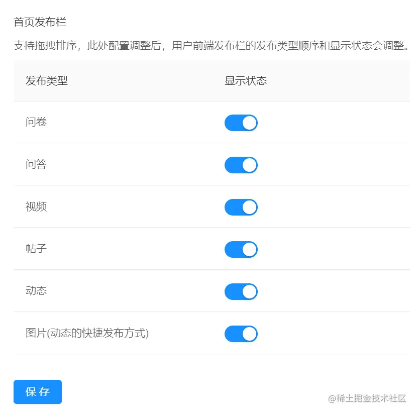 管理后台-社区配置-发布配置,支持隐藏/显示/拖拽排序