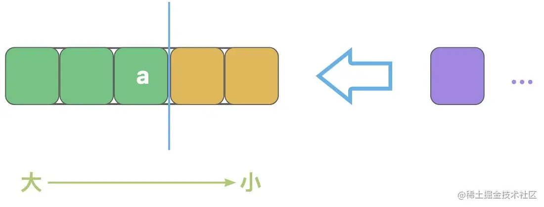- 当紫色元素入栈时,蓝色线条左侧元素均大于紫色元素,黄色元素均小于紫色元素