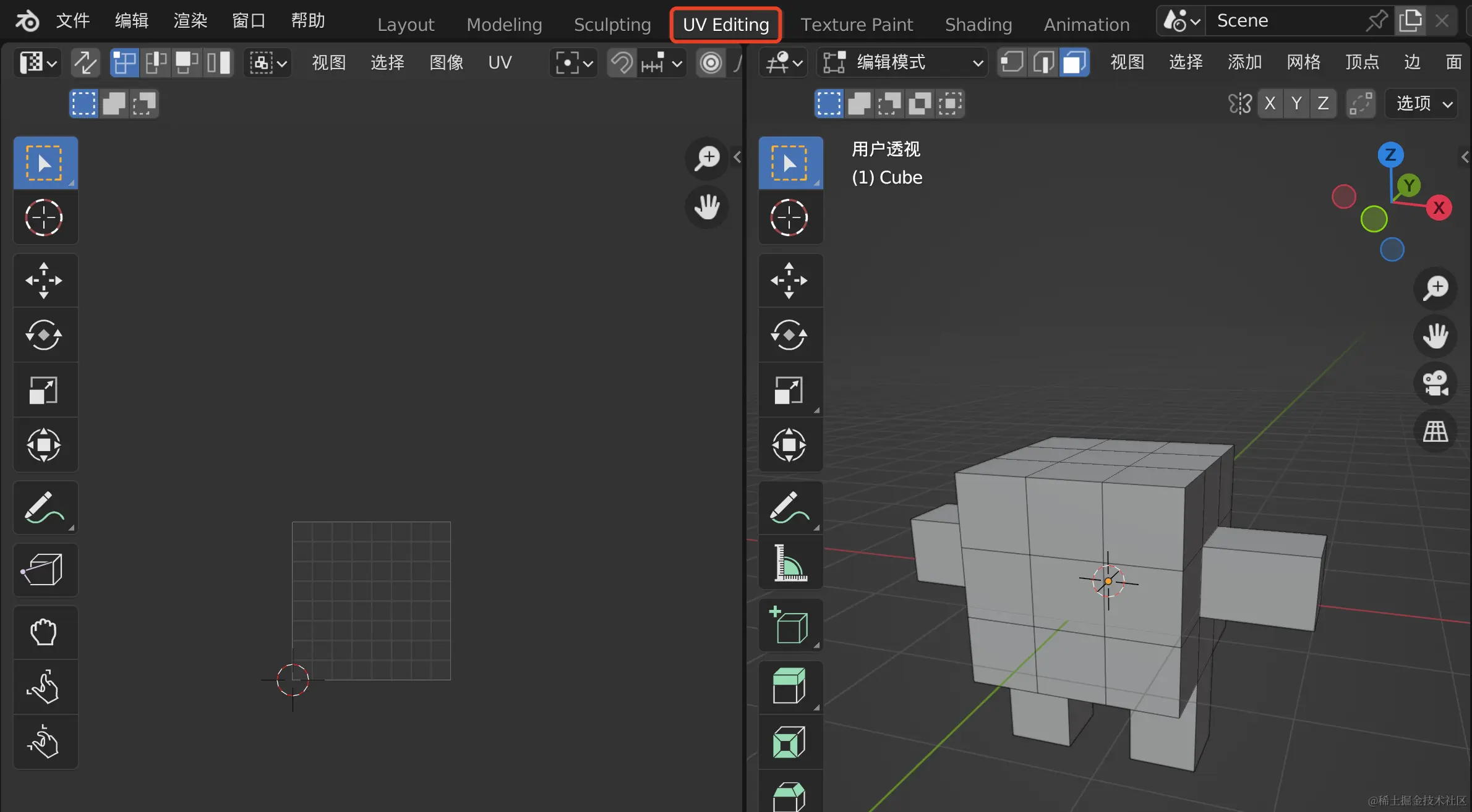我们进入到UV Editing工作模式,Blender会自动帮我们拆分2个窗口,左边的是UV编辑器,右边的是我们之前一直在使用的3D视图