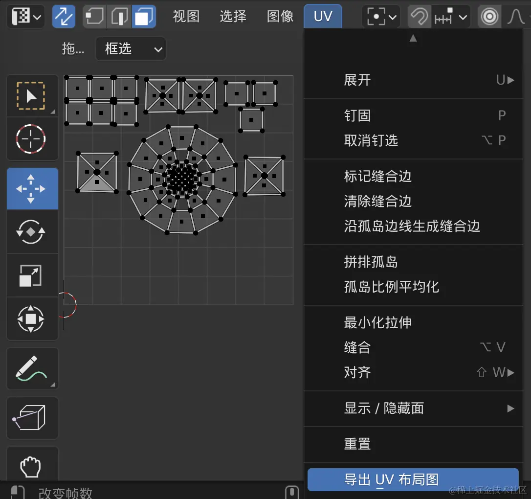 因为Blender支持局部UV展开,所以我们在展开UV前,需要进行一次全选操作,这样才会将整个模型的面展开。