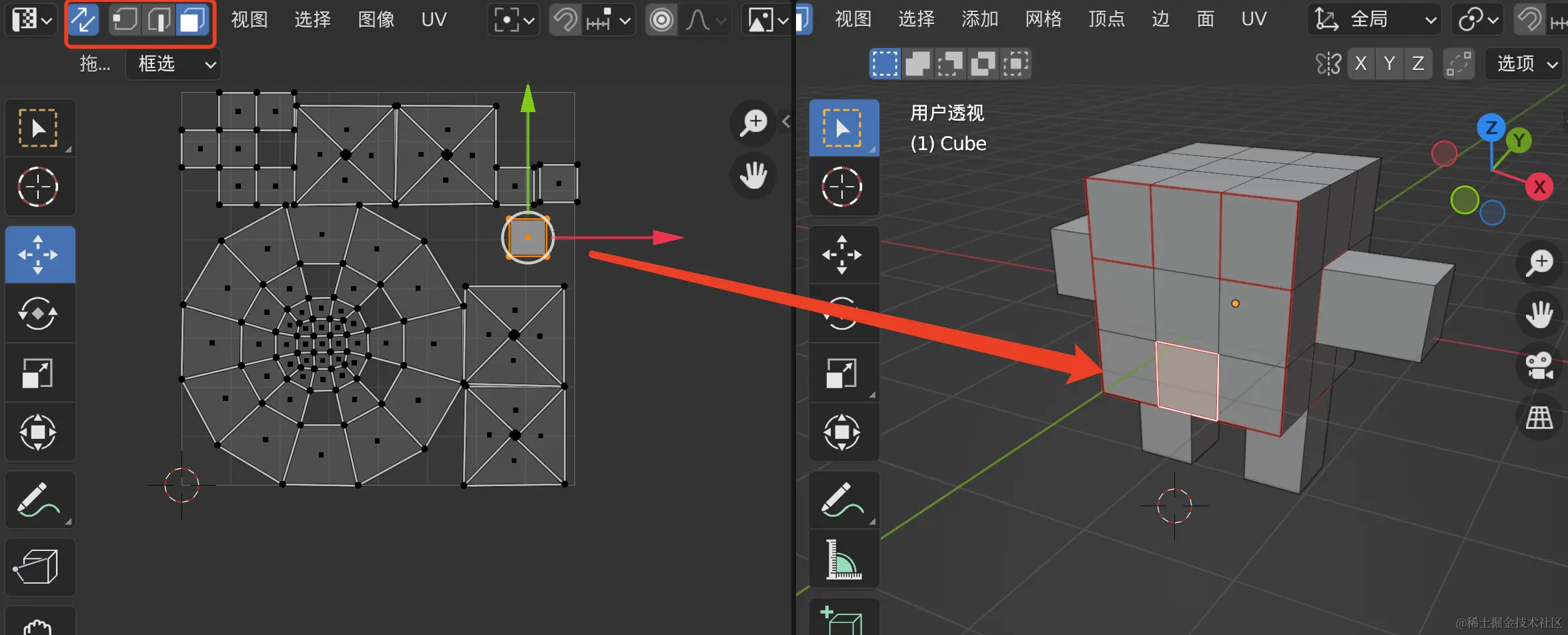 我们在左侧的UV编辑器中,打开选取同步,进入到面选择模式,当我们选择一个面时,可以很清晰的观察到对应关系。