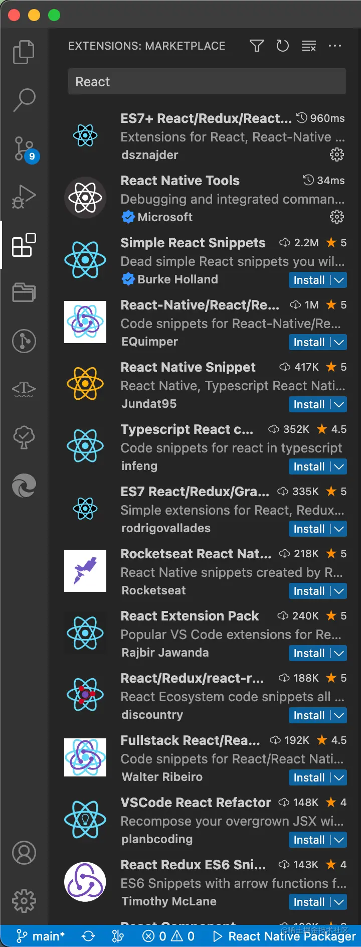 对于 VSCode 来说,插件数量多入牛毛,对于常见开发场景来说,有很多对应的处理插件,需要用到就在 Marketplace 搜索一下即可,比如 React 项目:
