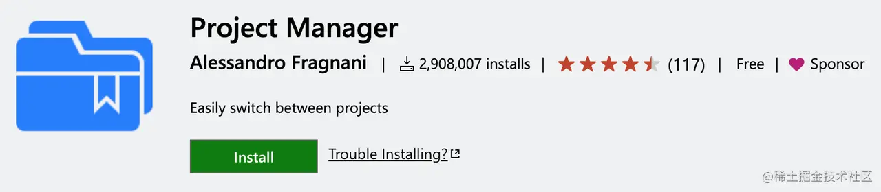 Project Manager 用于管理项目,有了它,可以帮你在 VSCode 中快速地在各个项目中切换,不需要痛苦地从文件目录中一级一级最终选到你想要的项目文件。