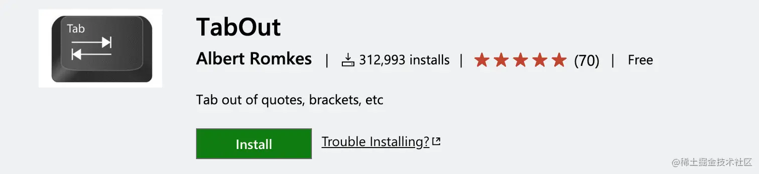 VSCode 的 Tab 键默认输出 \t,对于习惯用过 WebStorm、Eclipse 的人来说非常不舒服,想要在括号处用 Tab 跳出,就可以利用到这个 TabOut。