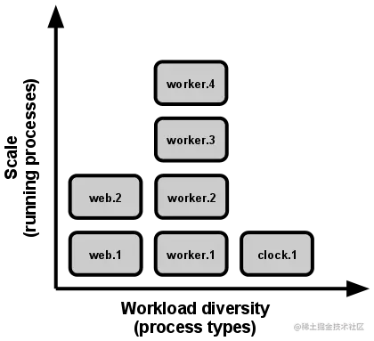 上述进程模型会在系统急需扩展时大放异彩。 12-Factor 应用的进程所具备的无共享,水平分区的特性 意味着添加并发会变得简单而稳妥。这些进程的类型以及每个类型中进程的数量就被称作 进程构成 。
