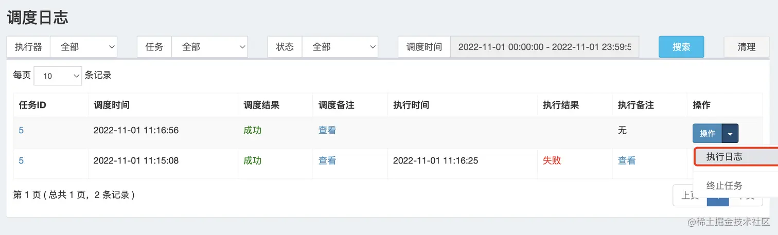 - 进入【调度日志】-> 【执行日志】