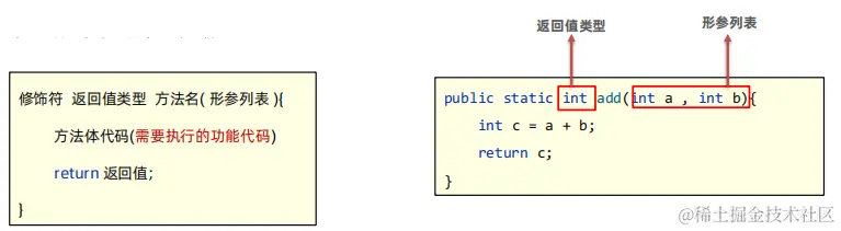 - 方法的返回值类型为void(无返回值),方法内则不能使用return返回数据,如果方法的返回值类型写了具体类型,方法内部则必须使用return返回对应类型的数据。