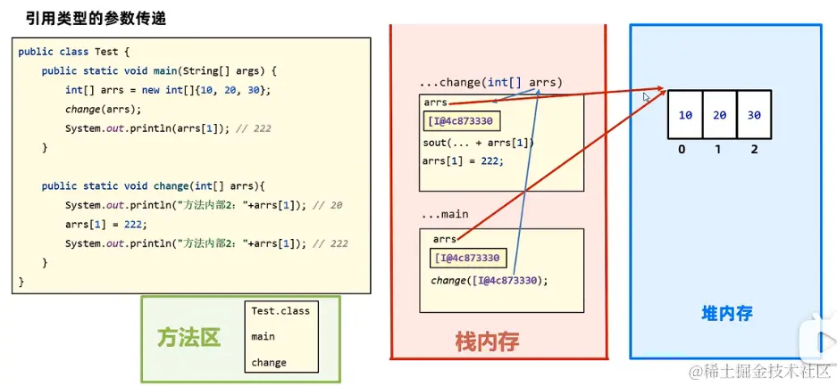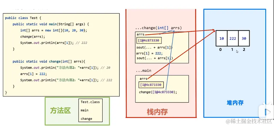 System.out.println("方法内部2:"+arrs[1]); // 222