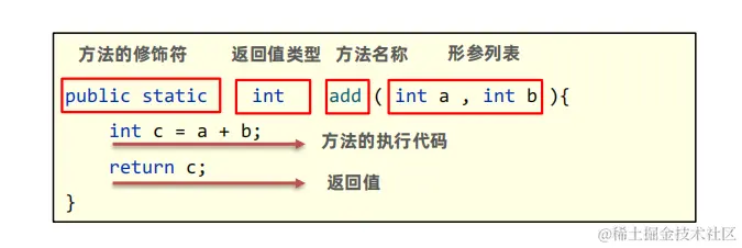 - 方法名称:自己取名,有意义,英文小写,驼峰模式。(有意义的名字即可)