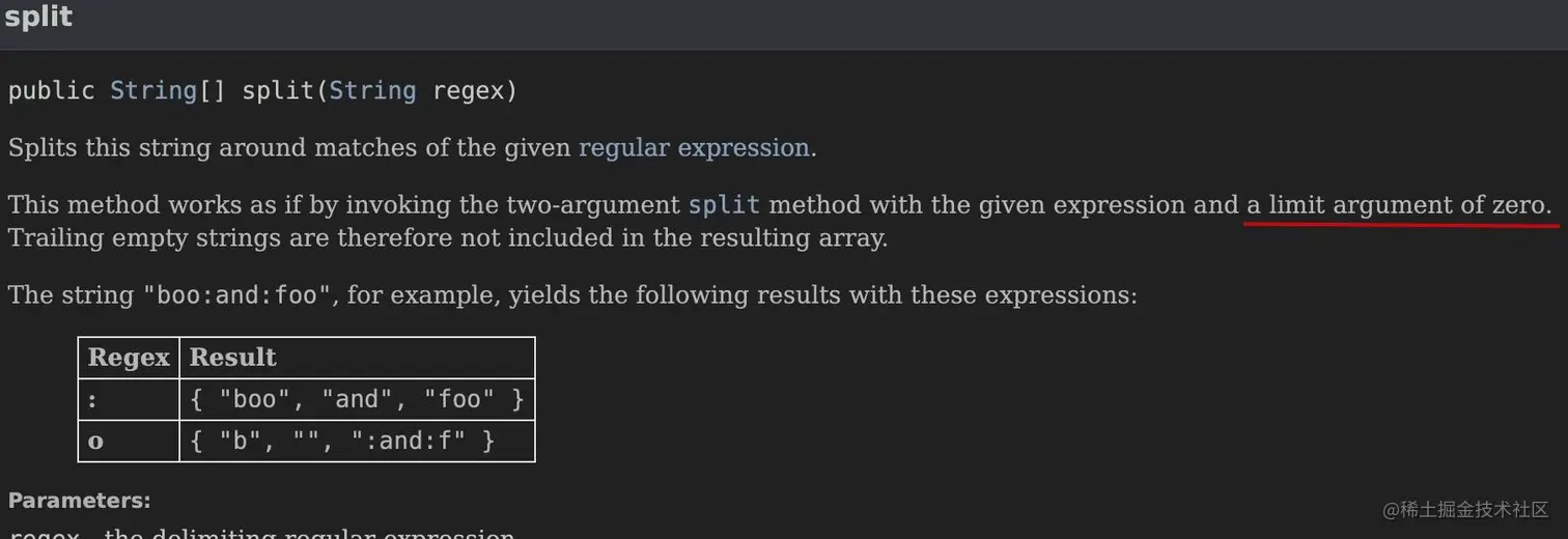 翻阅了 Java 的 API 文档,发现原来 Java 中的 split 方法确实跟其它语言是不一样的,这一点我们特别容易忽略