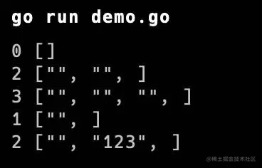 printStrs(strings.Split("", "~")) // 1 ["", ]