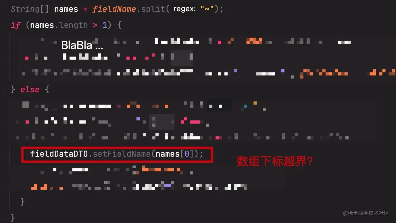 最终经过排查发现,在上述代码段中,当 fieldName 的值为 "~" 的时候,我们访问 names[0] 就会抛出 ArrayIndexOutOfBoundsException,为什么会这样呢?