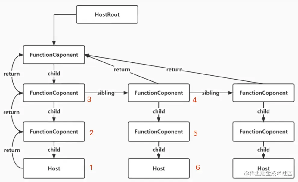 我们的遍历是从最低层开始的,即我们从1节点开始,进入siblings循环,进入第一个子循环,判断其是否有兄弟节点,没有就返回父节点,图中2节点,之后继续返回3号节点。该节点存在兄弟节点,进入第二个子循环,因为4节点的类型不符合(要求HostComponent或者是HostText,而4节点是FunctionComponent),则继续向下遍历到5节点,之后到6节点。如果6节点flags是Placement则继续siblings循环,继续以6节点开始重新循环,直到找的正确的节点,返回其真实DOM,如果找不到正确的节点就返回null。