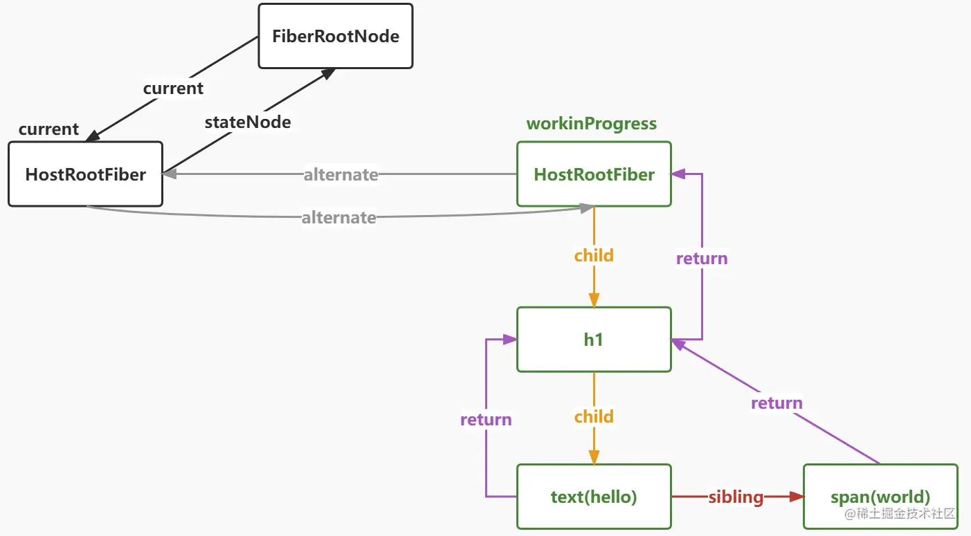 我们都知道在react中,每一个节点都会对应一个fiber节点。当然这里也有特别的一点,就是对于单一的文本节点,是不会再为其创建单独的fiber节点的,比如<h1>hello<span>world</span></h1>这个结构中'h1'有'hello'和'span'两个子节点,那么react就会为'hello'创建一个对应的fiber,而'world'是span节点的唯一一个子节点,那么react就不会为'world'创建fiber,而是把world作为属性挂载到span的属性上,这里算是fiber的一个小优化吧。