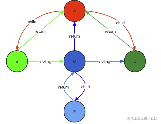 对于官方的描述可能你有一些模糊,下面我们从结构切入看看它到底长什么样。我们知道,react每一个节点都会对于一个fiber节点,为了能够方便自由暂停,继续工作,把fiber节点设计的尽可能的独立。每个fiber独立,通过指针使其相互连接,这样就形成了一个树,实际上就是一个基于链表的树。