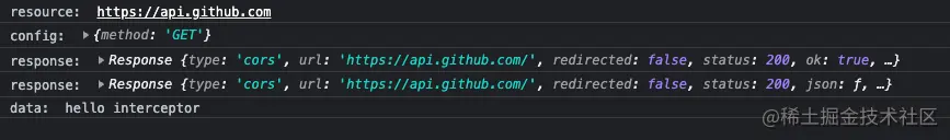 拦截器的原理很简单,原生fetch,接受两个参数,一个是请求路径resource,resource可以是url也可以是request对象,另外一个参数是config,可以配置method,header等请求参数。而拦截器则是通过替换window.fetch,在其外面再套一层处理起request以及response。