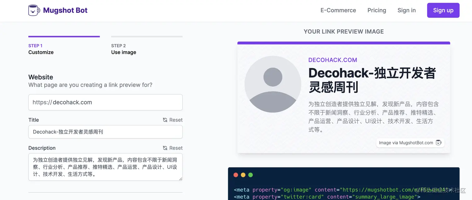 - mugshotbot - 这个产品挺有用的,用来自动创建 og:image 标签。自动设置一个好看的动态链接预览。比较符合海外市场用户需求,很适合独立开发者做。有兴趣可以研究一下。
