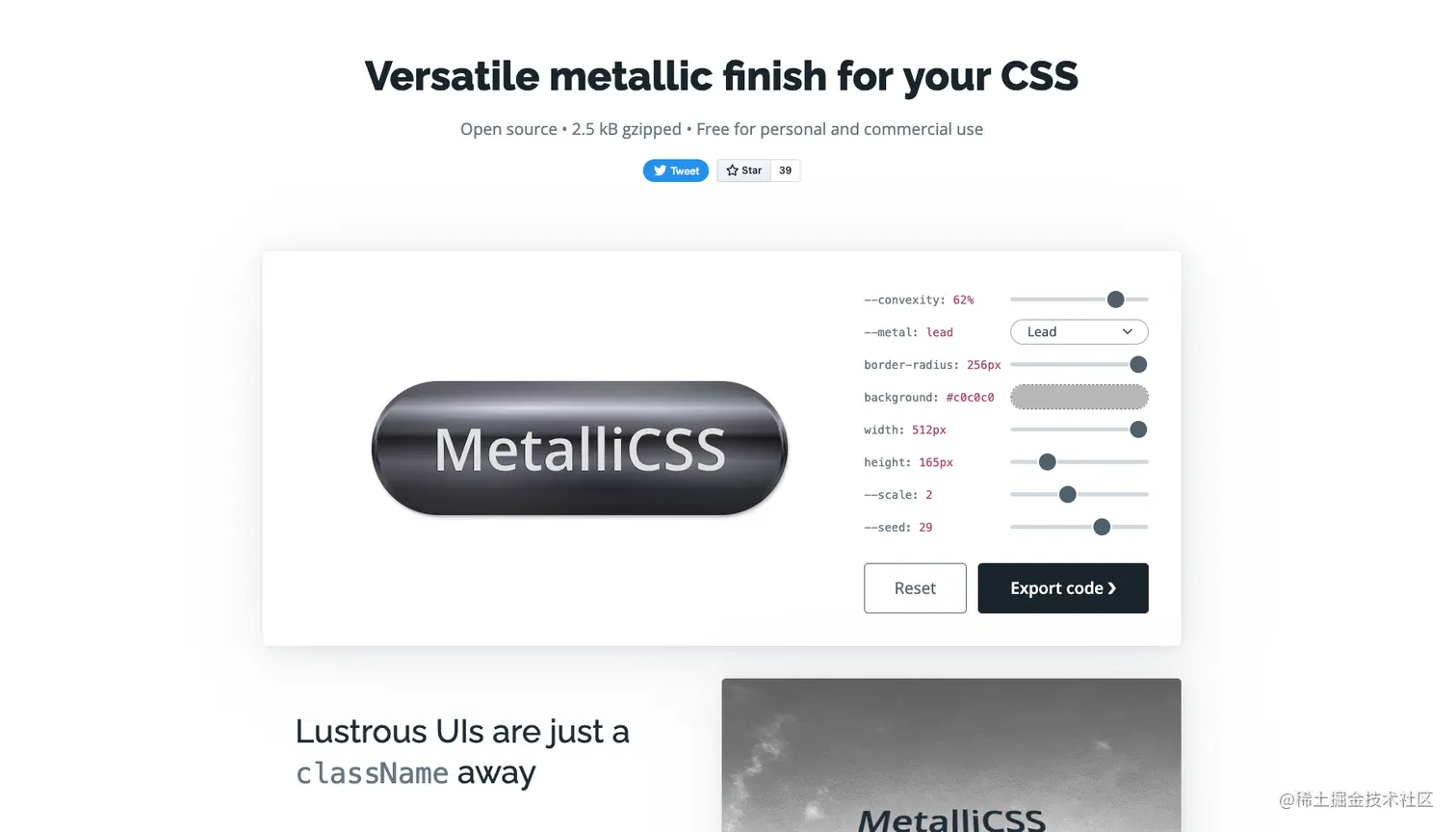 - metallicss - 这个开源的 JavaScript 库可以给页面元素添加金属质感。很有用啊做一些复古的界面。或者做一个有个性的按钮,这个库有几种不同的材质可以去试试。